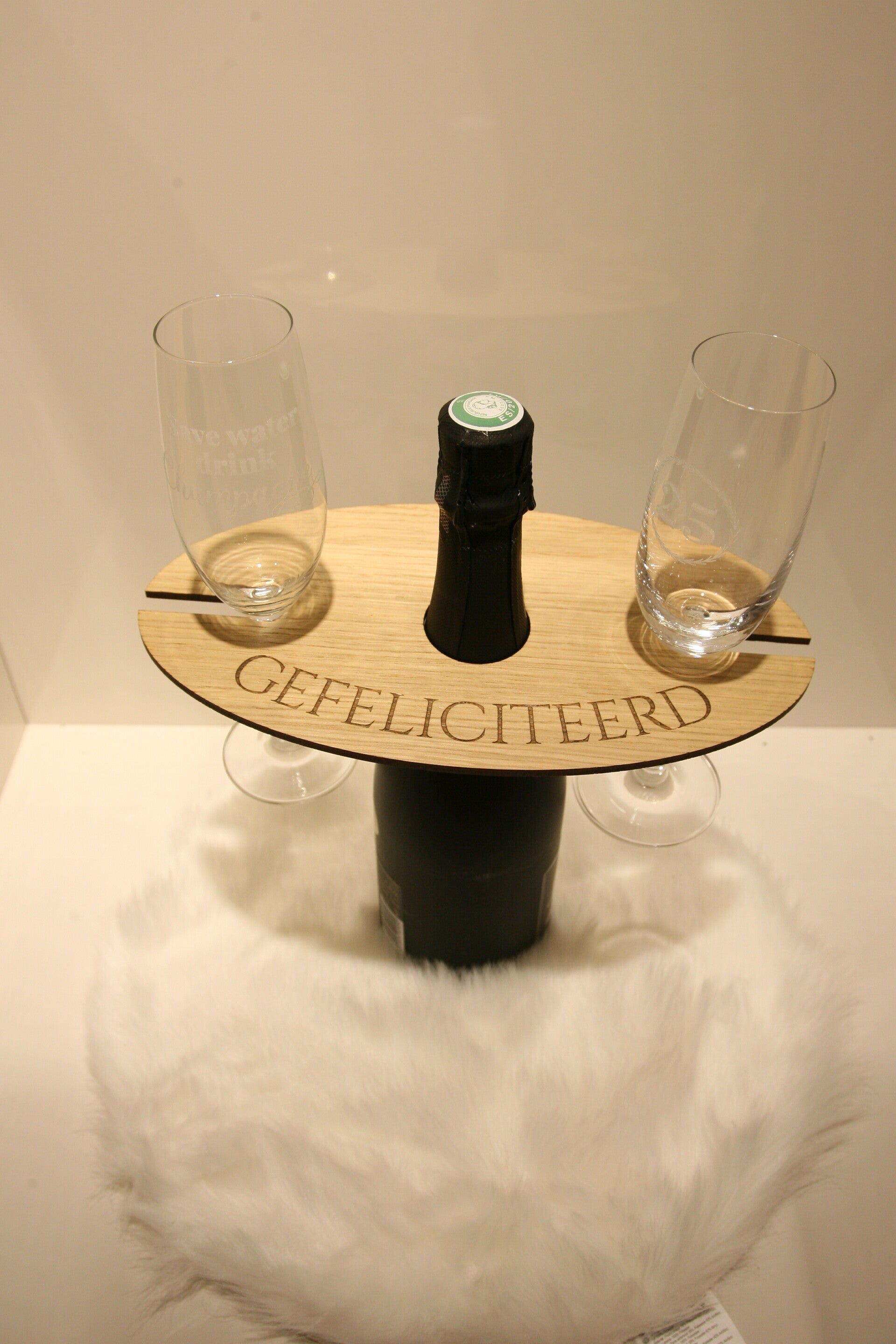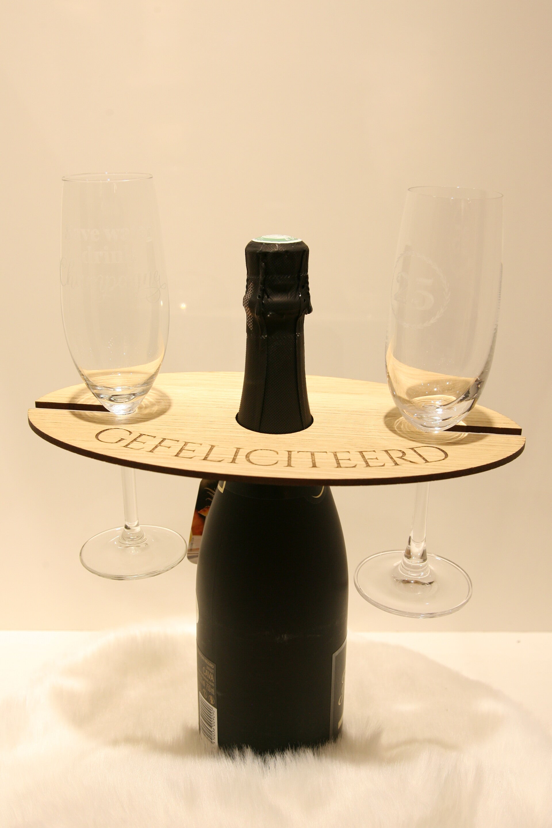 plankje om 2 glazen op een fles te hangen in 4mm mdf met fineer.